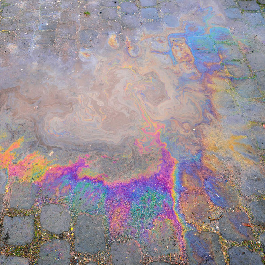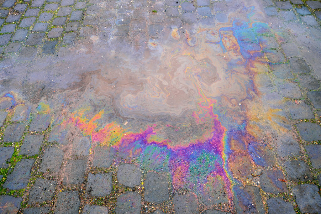Durch auslaufende Geräte oder Fahrzeuge. Öl wird tief in offenporige Steine eingesogen und ist schwer entfernbar.